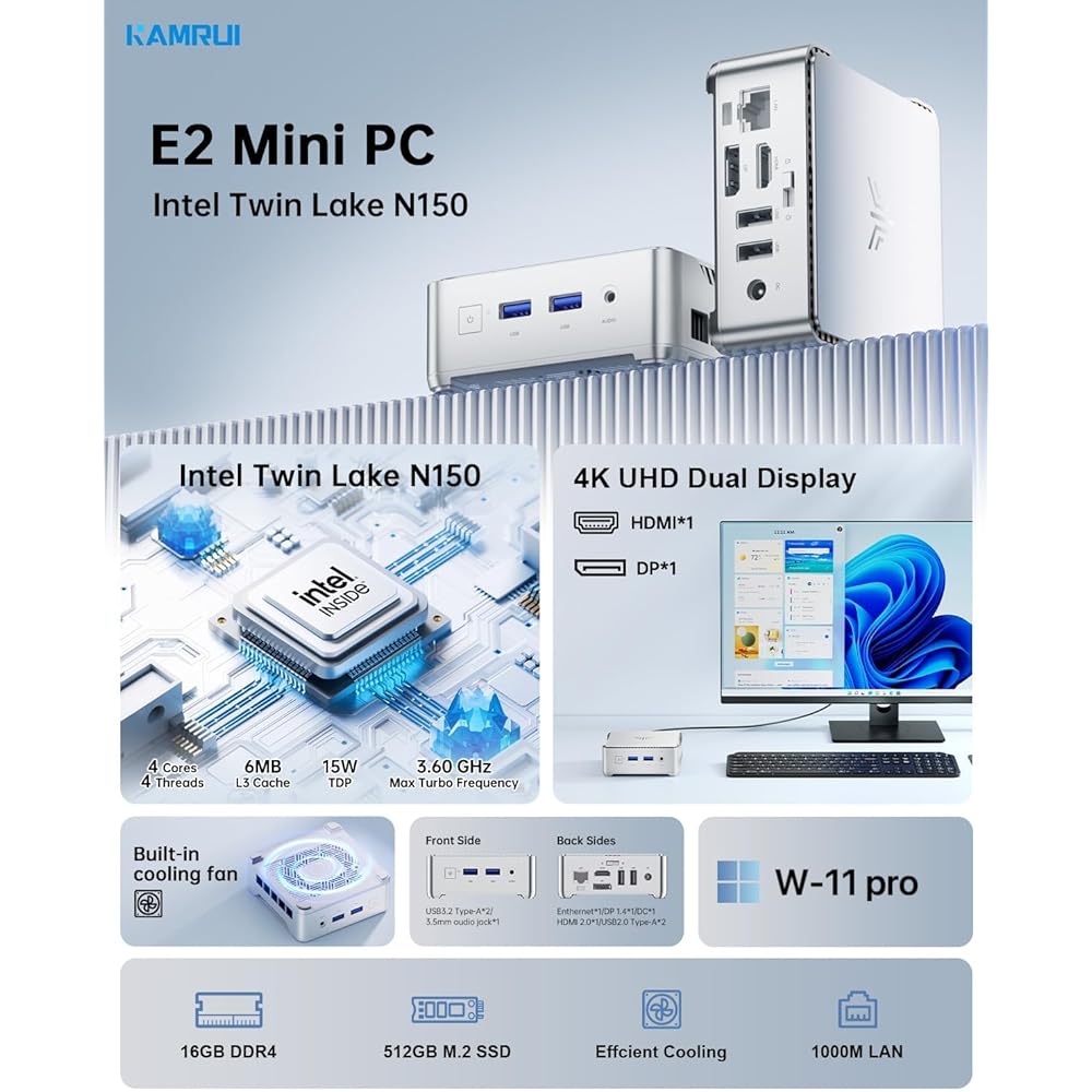 캠루이 E2 미니 PC 11 프로 인텔 트윈 레이크 N150 미니 컴퓨터 16GB RAM 512GB M.2 SSD 마이크로 PC 지원