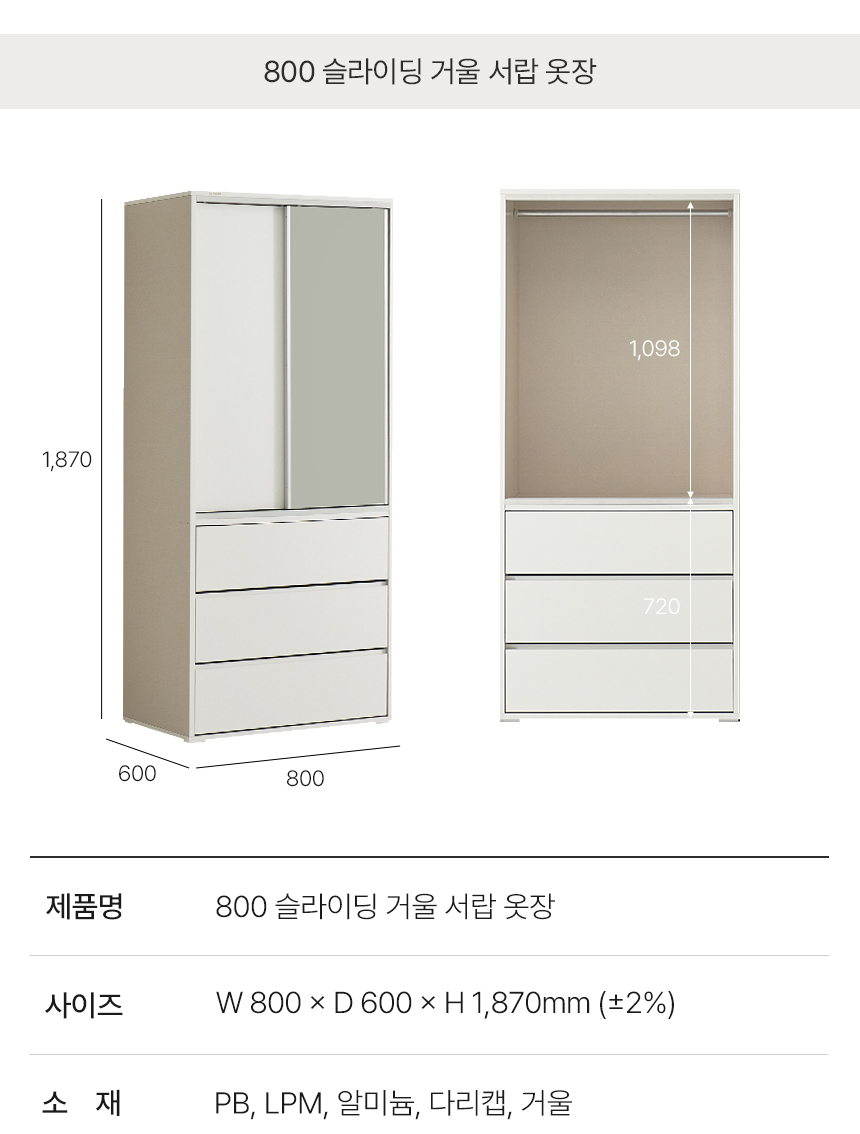 (현대Hmall)동서가구 토리클로젯 슬라이딩 800 거울서랍옷장 DF926498