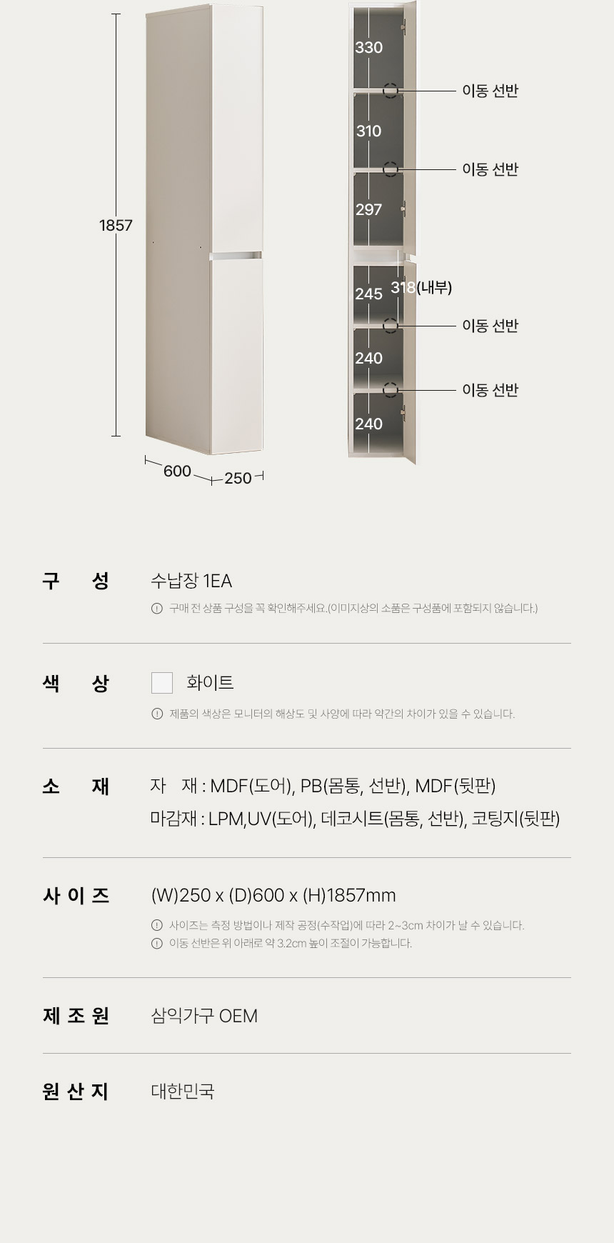 삼익가구 더캐빈 250 틈새 수납장 깊은 수납장무광UV도장)