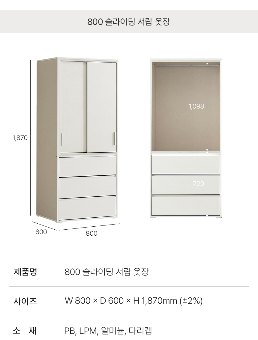 (현대Hmall)동서가구 토리클로젯 슬라이딩 800 서랍옷장 DF926492