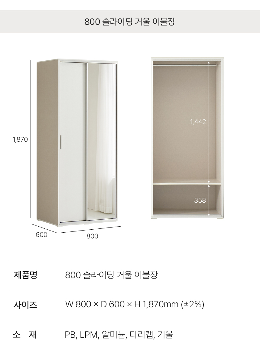 (현대Hmall)동서가구 토리클로젯 슬라이딩 800 거울이불장 DF926496