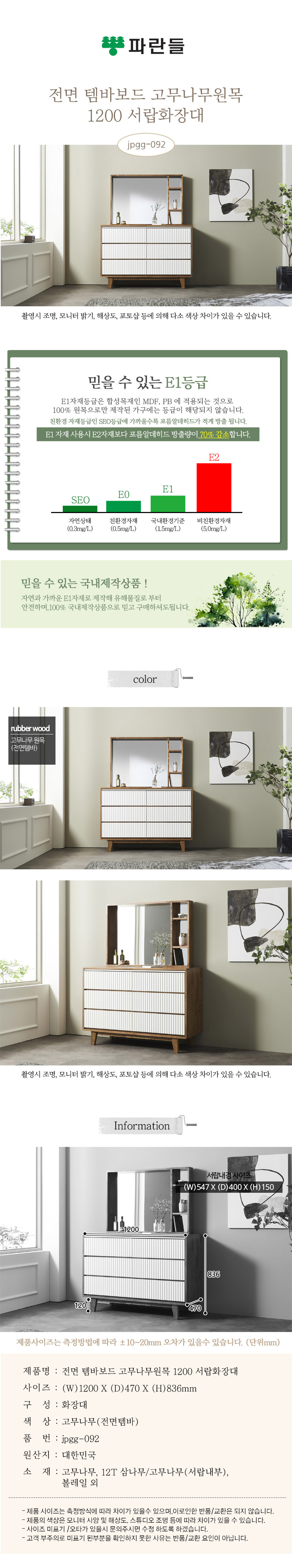 파란들가구 템바보드 고무나무원목 1200 서랍화장대세트