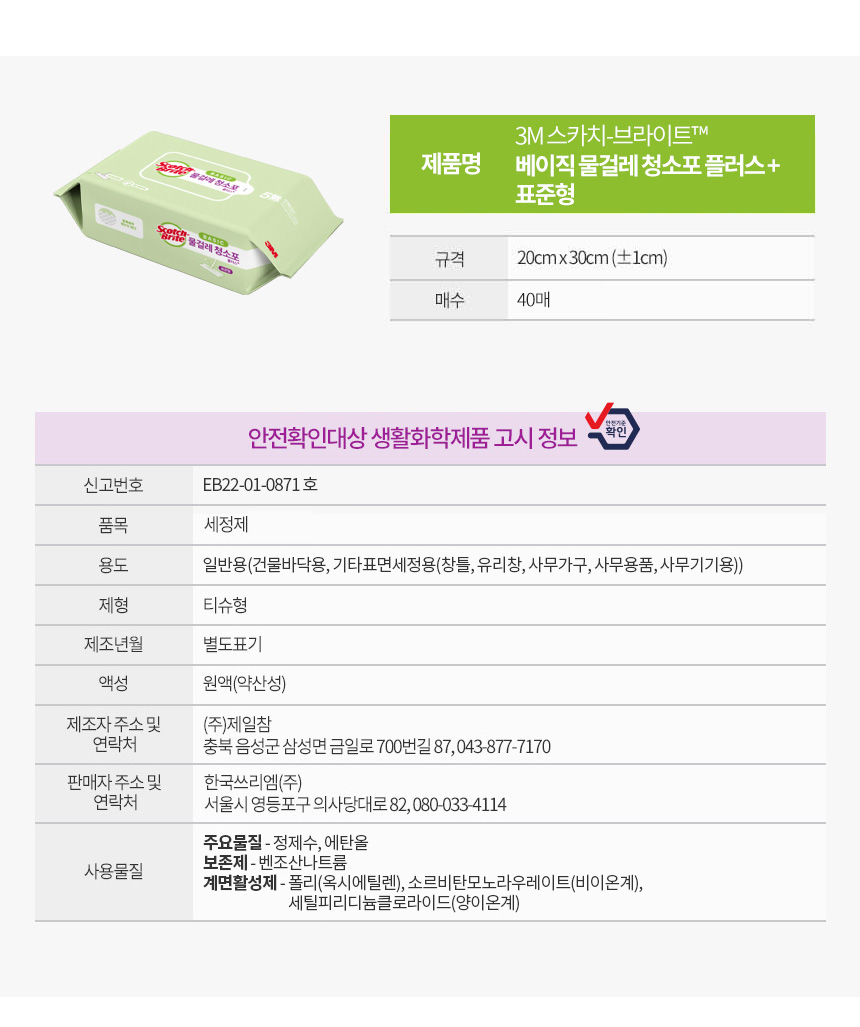 스카치브라이트 표준형 베이직 물걸레 청소포 40매
