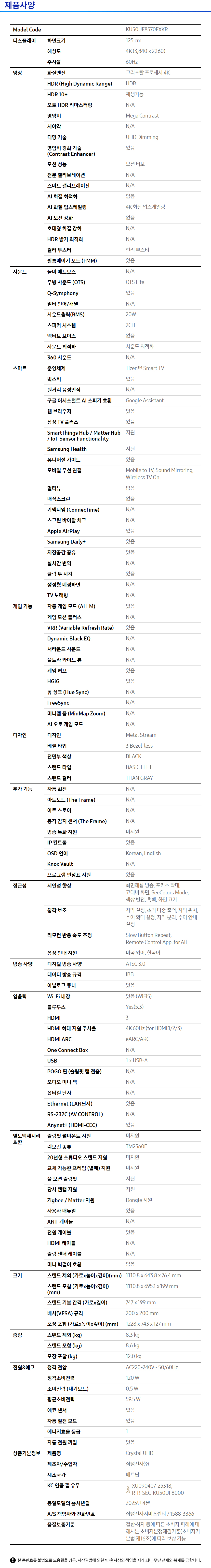 (으뜸효율) 삼성 KU50UF8570FXKR 125cm 4K UHD TV