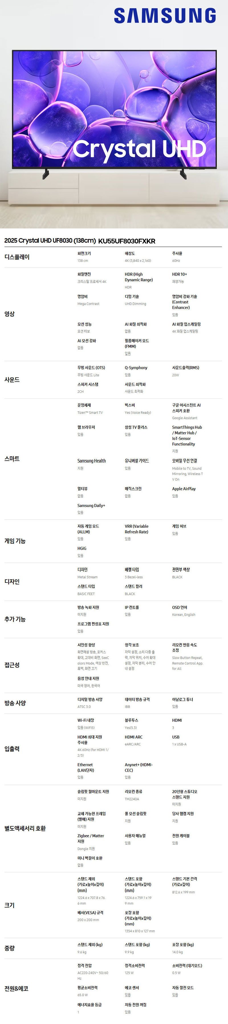 (삼성)O 삼성 Crystal UHD TV 138cm 스탠드형 KU55UF8030FXKR(S)