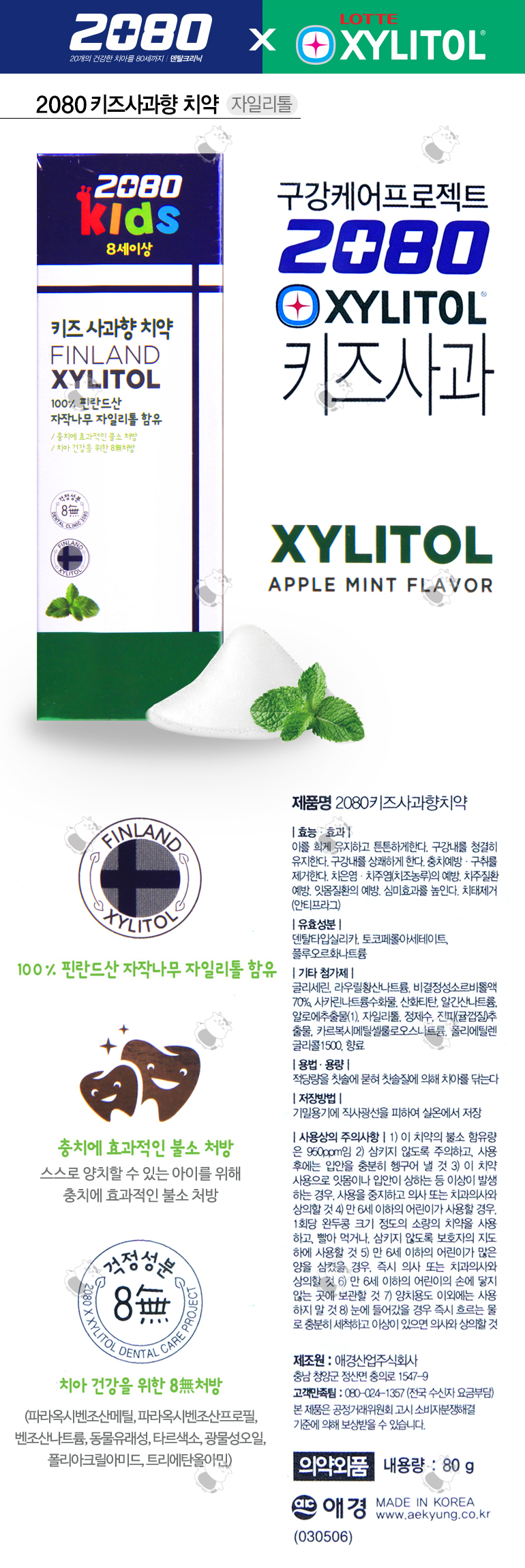 2080 자일리톨 키즈 사과향 치약 80g 3개 어린이 초등학생 치약