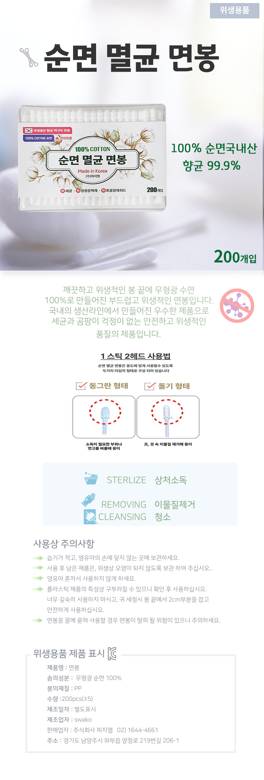 피지엘 순면 멸균면봉(100%순면 국내생산/ 향균99.9%) 200개입
