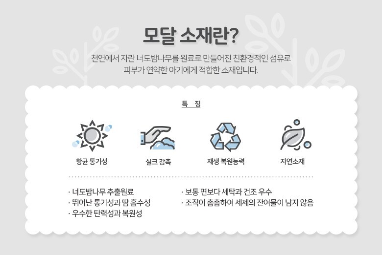 모달 테리는 일반 타올지에 비해 터치감이 부드럽고, 흡수력이 뛰어나 아기피부에 적합한 최상의 소재 입니다.