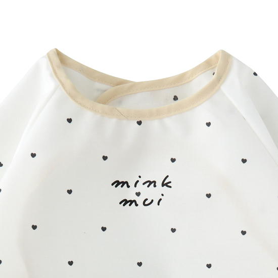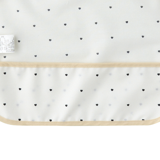 깔끔한 모노하트 패턴을 매치한 긴팔 방수 이유식 턱받이입니다. 집과 외출 시 식사시에 이유식 턱받이로 어린이집에서는 미술 가운& 앞치마로 다양하게 활용 가능합니다. 활동성이 좋은 스타일로 디자인되어 0~6세까지 사용이 가능하며 몸판에는 방수 코팅 처리로 옷에 음식이 묻지 않도록 보호해주며 포켓부분에 떨어진 음식물들이 모이도록 디자인된 이유식 턱받이입니다. 안쪽에 단추와 고리가 부착되어 있어 접어서 보관하고 휴대하기 용이합니다.