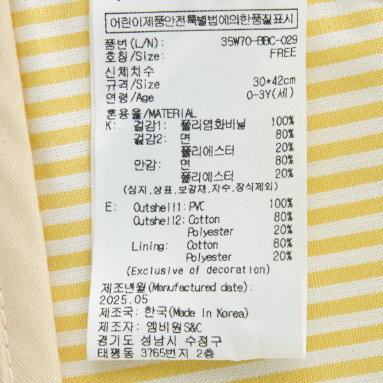 소 재...........겉감 1-폴리염화비닐100% / 겉감 2-면80%,폴 리에스터20% / 안감-면80%,폴리에스터20%