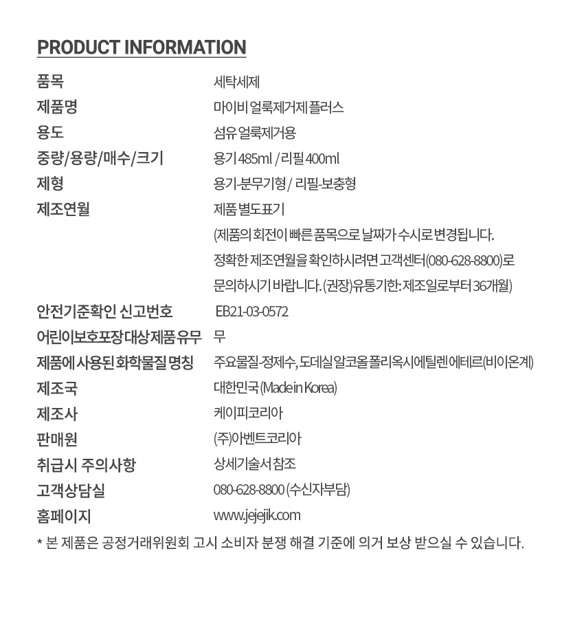 얼룩제거제 플러스 485ml (유아 아기/세탁세제/유연제/목때/누런때/표백) + 100원딜 추가옵션