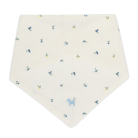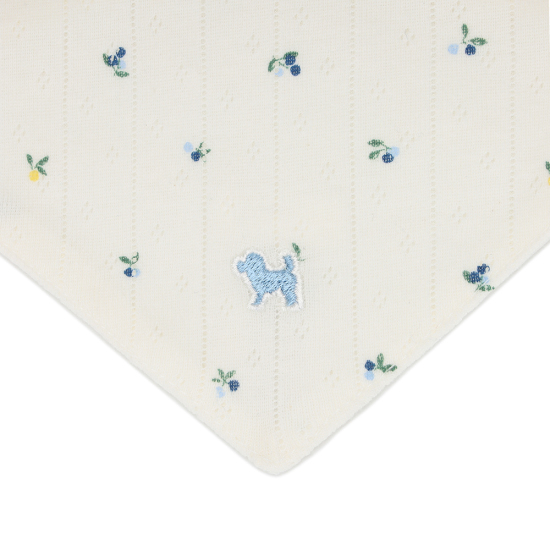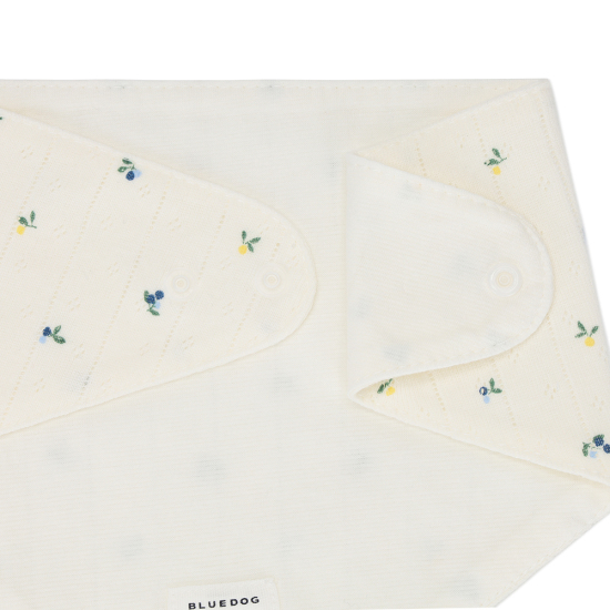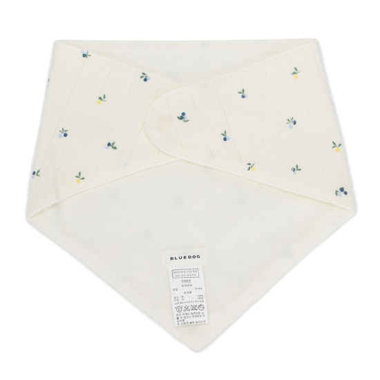 신축성이 좋은 후라이스 조직에 아일렛 자가드를 넣어 제직한 소재를 사용한 스카프 빕 입니다.