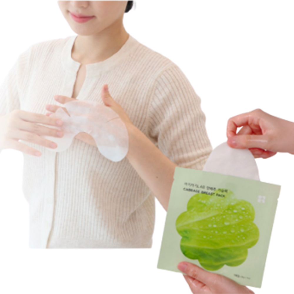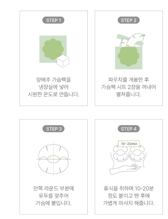 팩을 사용하기 전 가슴 부위를 깨끗이 씻고 물기를 제거합니다. 양배추 가슴팩을 가슴에 붙이고, 20~30분 동안 휴식을 취하세요. 사용 후에는 가슴을 원활하게 마사지해주면 좋습니다.