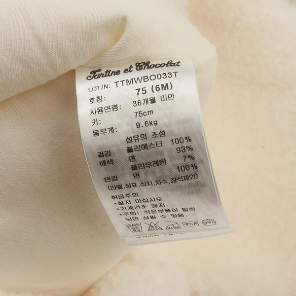 세탁방법 및 취급시 주의사항 : 삶지 마십시오. 기계건조 금지. 주의! 작은 부품이 탈락되면 삼킬 수 있음.
