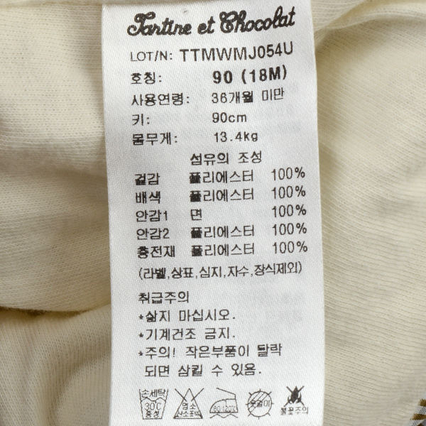 세탁방법 및 취급시 주의사항 : 삶지 마십시오. 기계건조 금지. 주의! 작은 부품이 탈락되면 삼킬 수 있음.