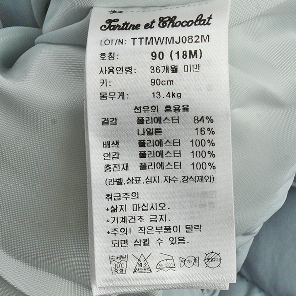 세탁방법 및 취급시 주의사항 : 삶지 마십시오. 기계건조 금지. 주의! 작은 부품이 탈락되면 삼킬 수 있음.