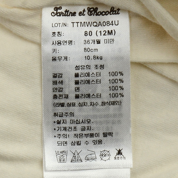 세탁방법 및 취급시 주의사항 : 삶지 마십시오. 기계건조 금지. 주의! 작은 부품이 탈락되면 삼킬 수 있음.