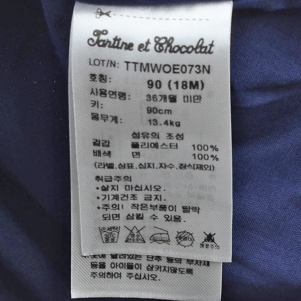 세탁방법 및 취급시 주의사항 : 삶지 마십시오. 기계건조 금지. 주의! 작은 부품이 탈락되면 삼킬 수 있음.