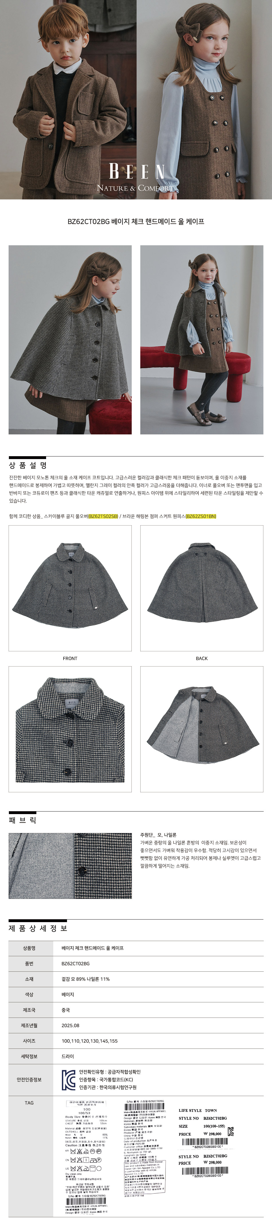 품명 및 모델명 : BZ62CT02BG 베이지 체크 핸드메이드 울 케이프