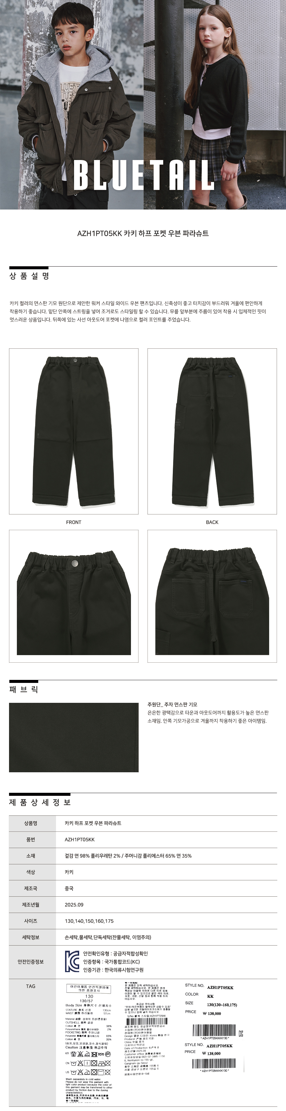제품소재 : 겉감 면 98% 폴리우레탄 2% / 주머니감 폴리에스터 65% 면 35%