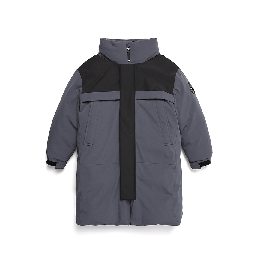 - 배색형 디자인이 매력적인 롱기장의 다운자켓입니다.