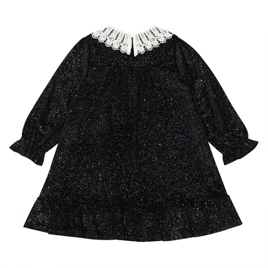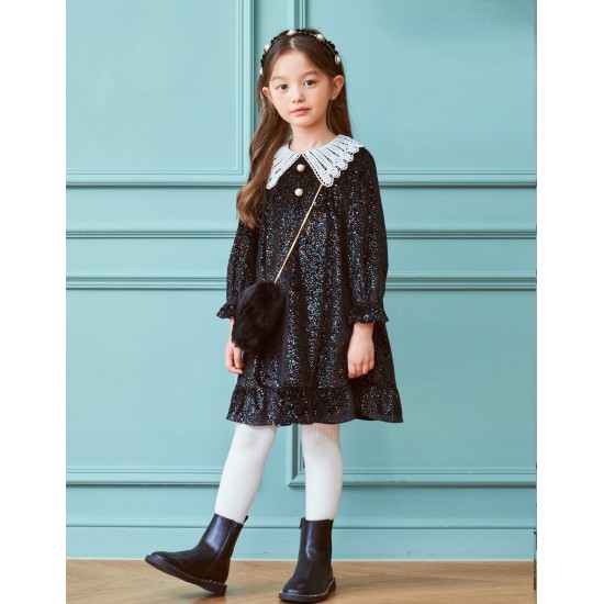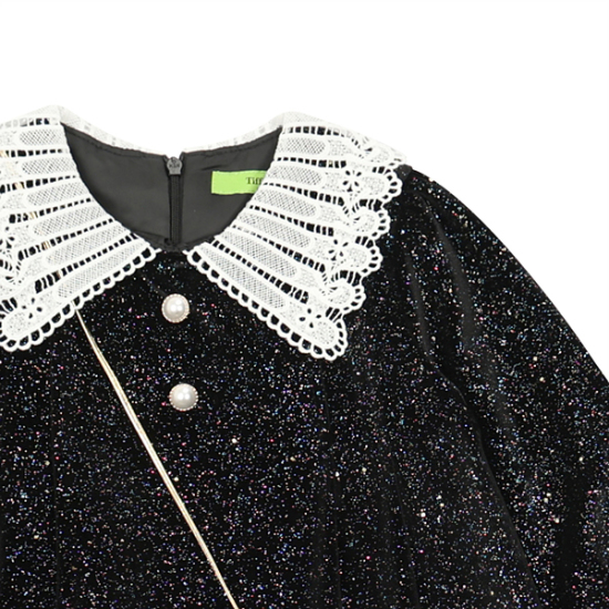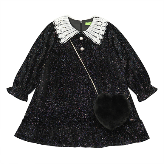 상세설명-화려한 오색 펄이 뿌려진 벨벳 원피스입니다. 넓은 레이스 카라 장식으로 포인트를 주고 블랙 퍼 하트 가방으로 고급스러움을 살린 원피스입니다.