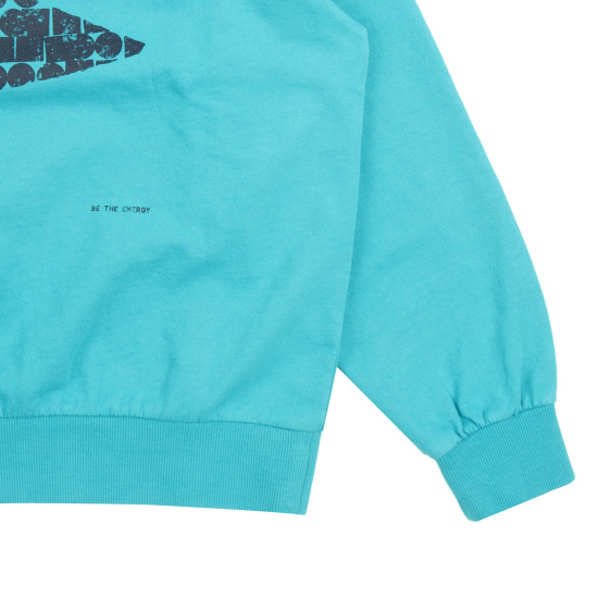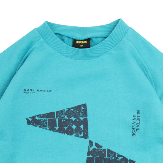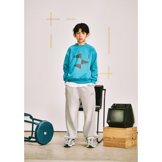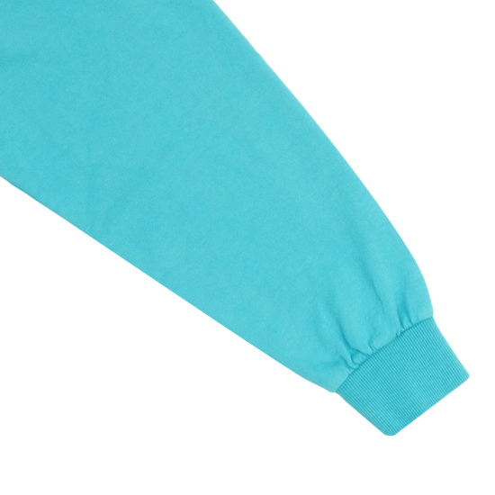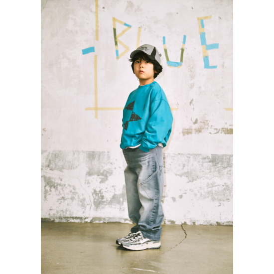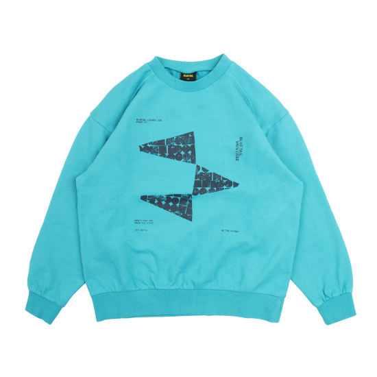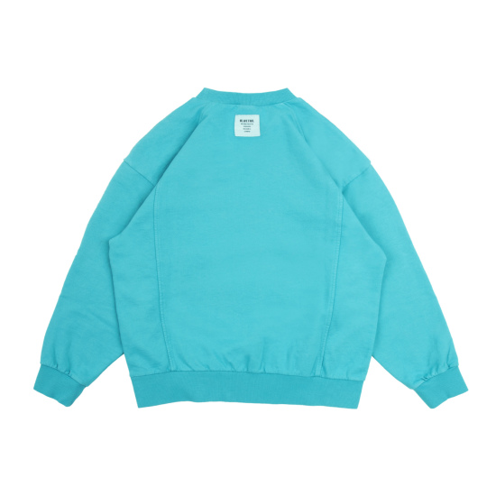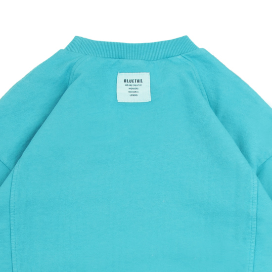 아쿠아블루 컬러감이 매력적인 미니쭈리 맨투맨입니다. 가먼트 다잉 기법을 사용하여 빈티지한 효과를 주었습니다. 기하학적인 도안의 나염이 딥한 네이비 톤으로 찍혀 포인트가 되며 빈티지하게 까진듯한 효과를 주었습니다. 어깨선엔 곡선 절개가 있으며 옷과 함께 다잉된 라벨의 컬러감 또한 멋스러운 아이템입니다.