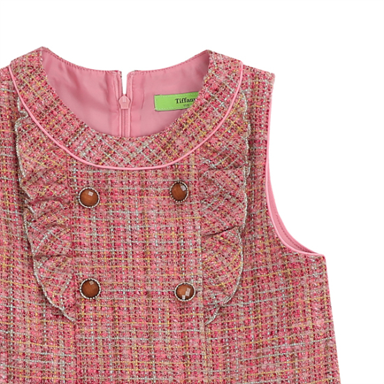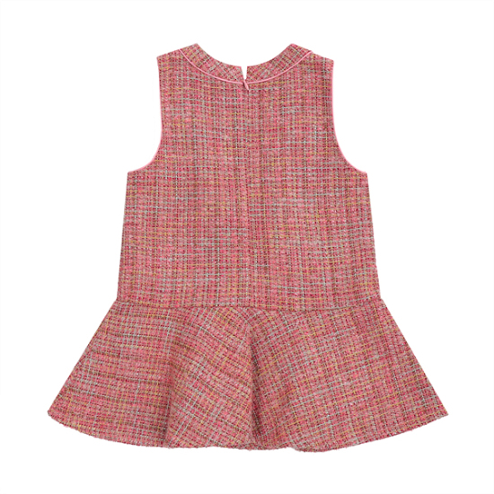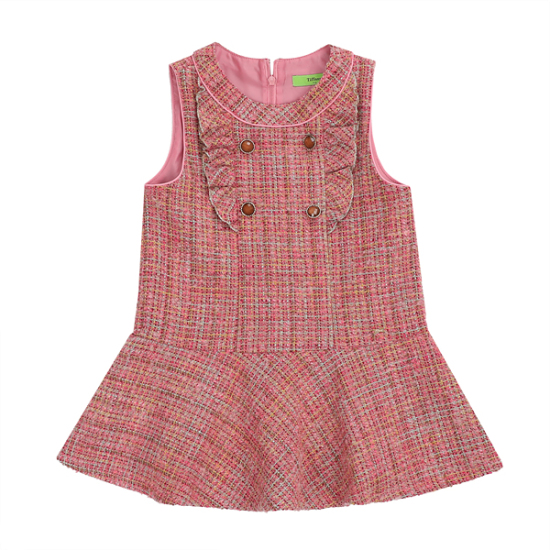 상세설명-골드 메탈사가 섞인 트위드 소재 JP/SK 스타일입니다. 플레어 라인의 밑단과 앞 라인의 프릴 장식이 사랑스러운 느낌을 주는 원피스입니다. 기본티와 레이어드하여 착용 가능하며, 핑크 코드와 함께 코디하여 분위기있게 연출 가능합니다.