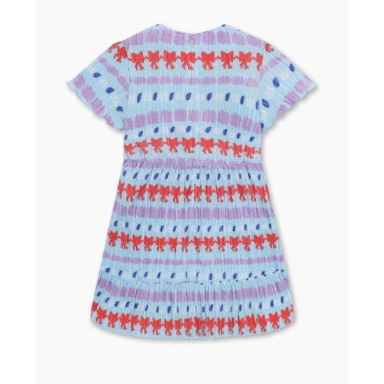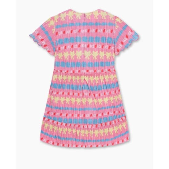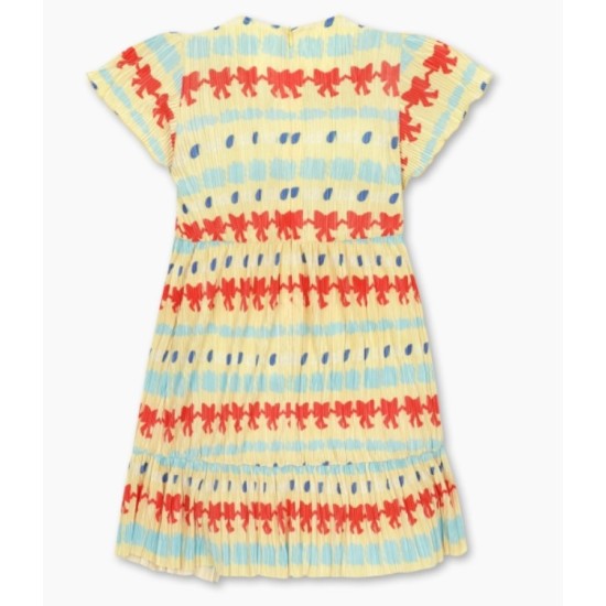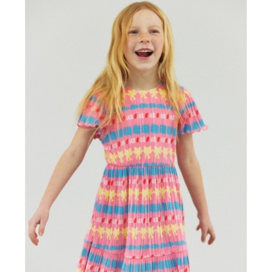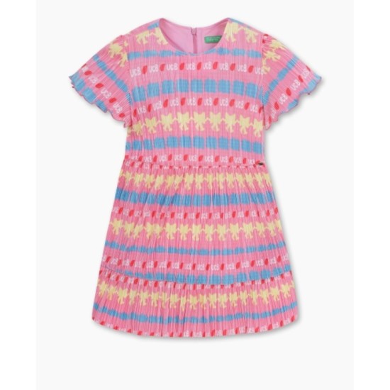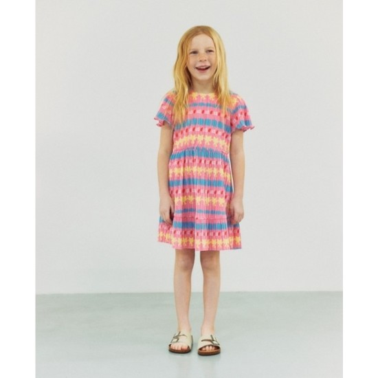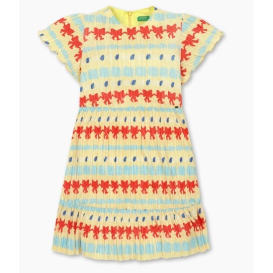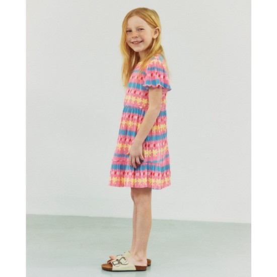 다양한 컬러감과 유니크한 패턴이 돋보이는 플리츠 반팔 원피스.