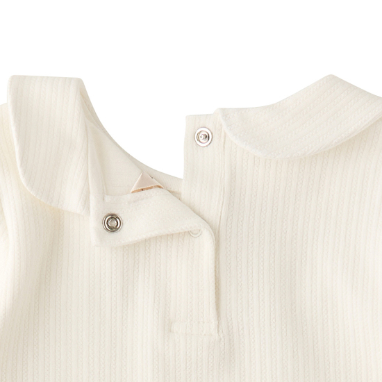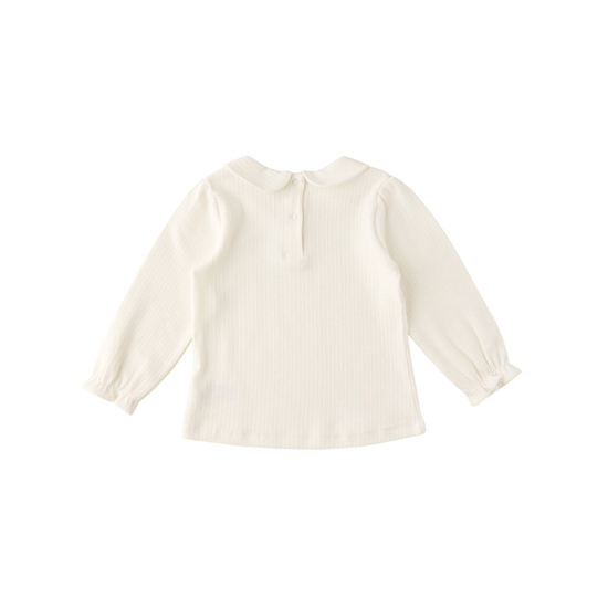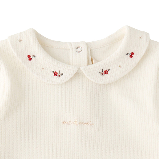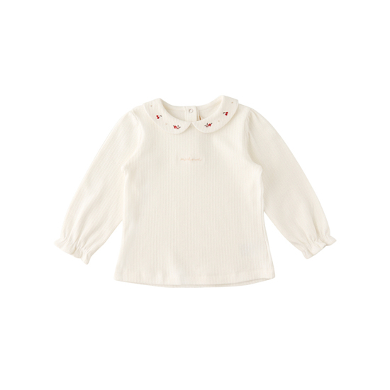쁘띠 플라워 열매 자수가 있는 카라와 고급스러운 아일렛 변형 골지 져지를 활용하여 다양한 코디로 연출할 수 있는 아이템입니다.