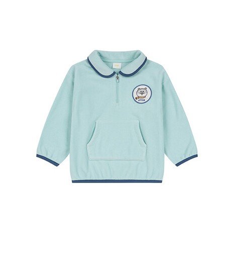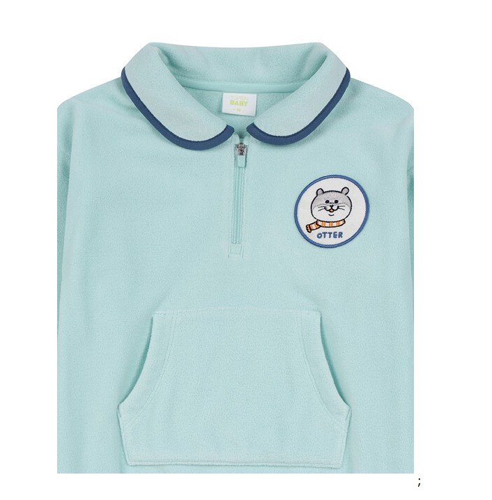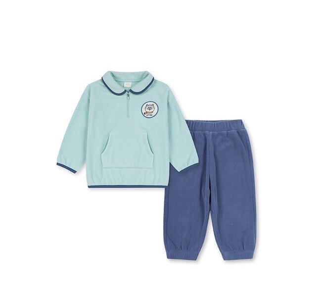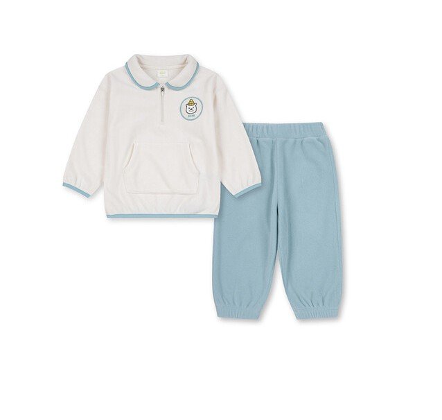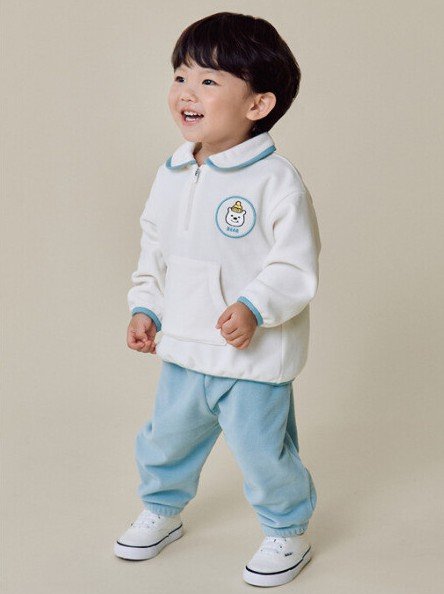 2. 카라가 있는 반집업 상의와 조거팬츠 셋업으로 캐주얼하게 입을 수 있는 남유아 제품