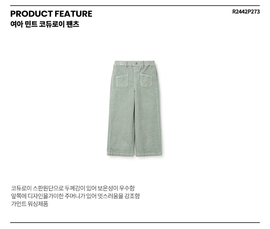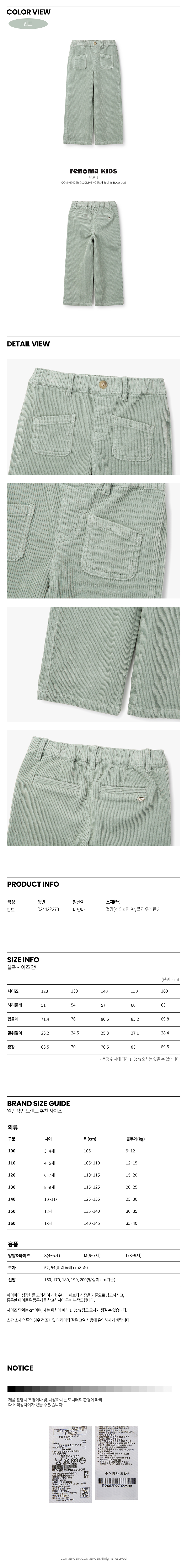 레노마키즈(본사직영) 여아 민트 코듀로이 팬츠 (R2442P273_22)