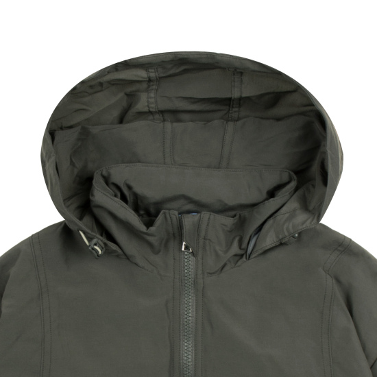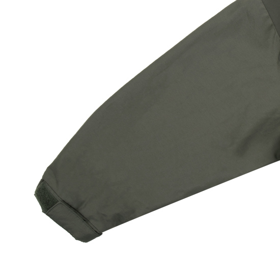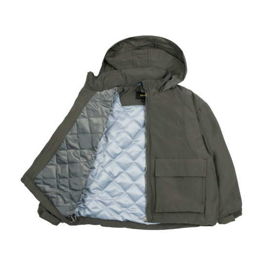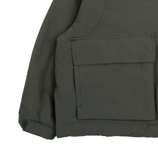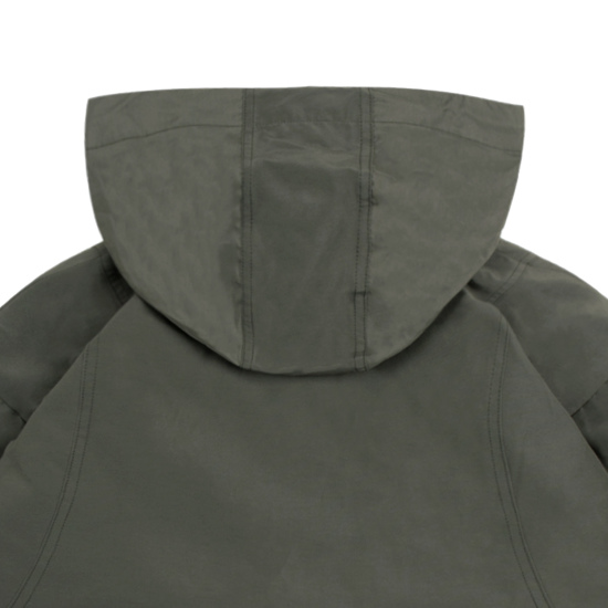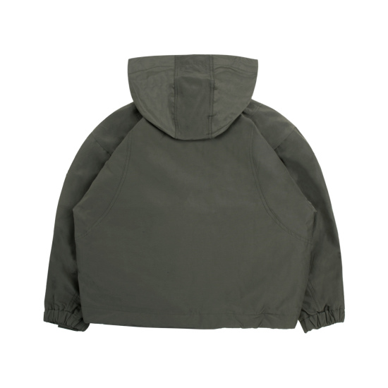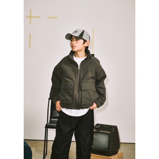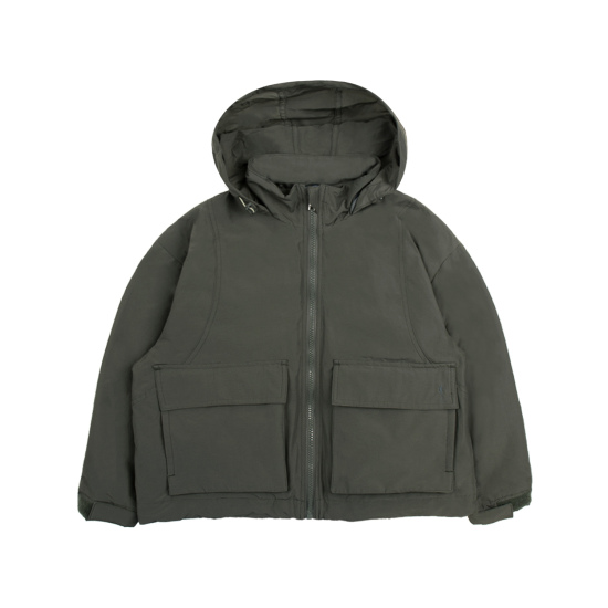 카키 컬러의 숏한 기장감의 윈드 브레이커입니다. 몸판에는 2oz 퀼팅이 있어 겨울에서 봄으로 넘어가는 간절기에 입기 좋은 아이템입니다. 좌우에 큰 사이즈의 아웃 포켓이 있어 활용도가 높으며 몸판에 곡선 라인의 절개로 포인트를 주었습니다. 밑단을 조여 연출하는 것을 추천합니다.