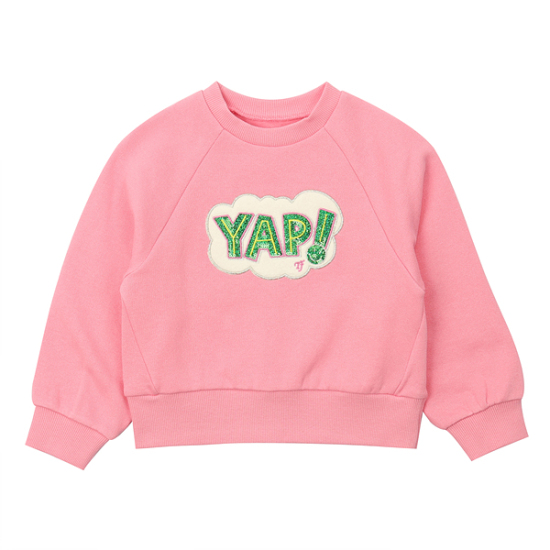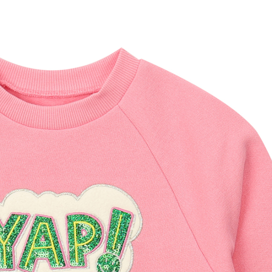 상세설명-라글란 소매 크롭 티셔츠로 귀여운 스타일의 티셔츠입니다. 앞에 플리스 패치와 스팽글 로고 자수가 포인트로 컬러감을 살려 준 스타일입니다.었습니다.