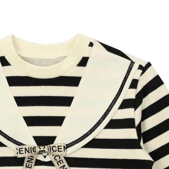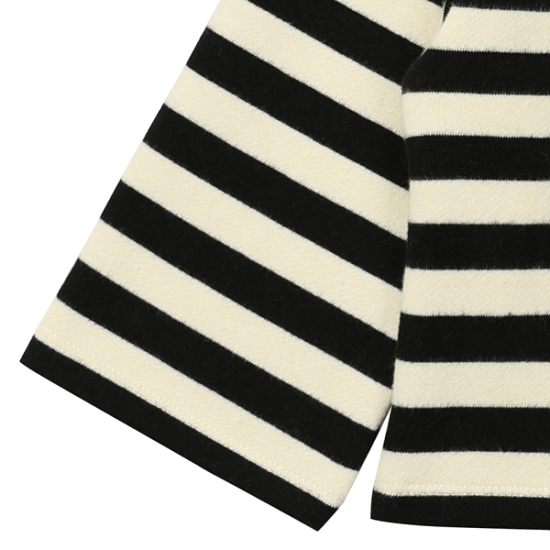 상세설명-스트라이프 기모쭈리 소재 크롭티로 앞넥라인에 장식 카라가 덧대어진 스타일입니다. 짧은 기장감으로 부츠컷 팬츠나 스커트에 코디하여 연출하기 좋은 티셔츠입니다. 골드 리본 브롯치 장식이 있습니다.