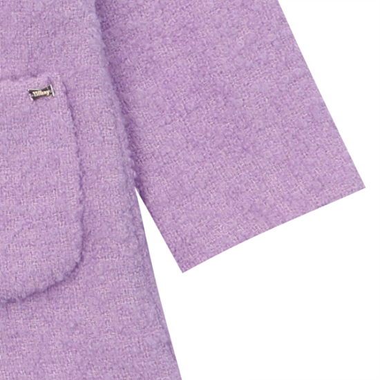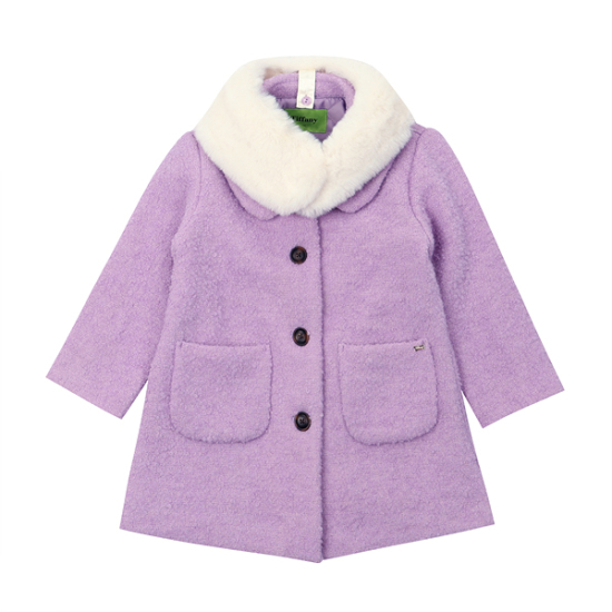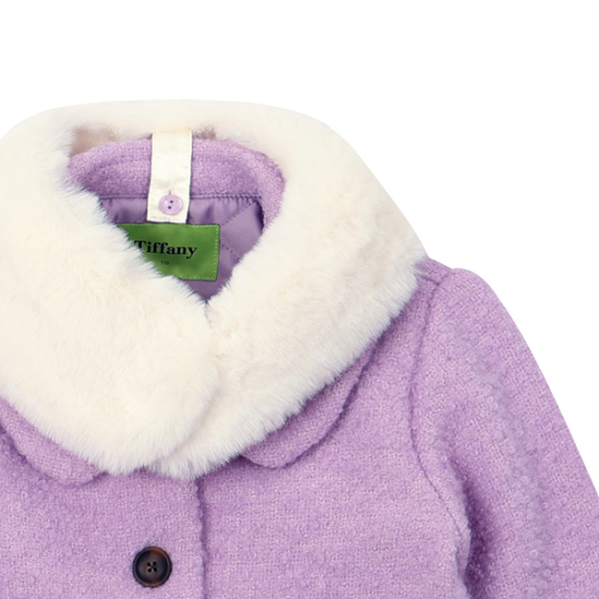 상세설명-캐시미어 포함 소재 포근한 터치감을 주는 보라 코트로 아이보리 퍼 장식 카라로 포인트를 준 스타일입니다.