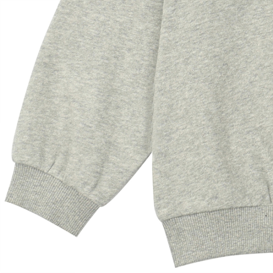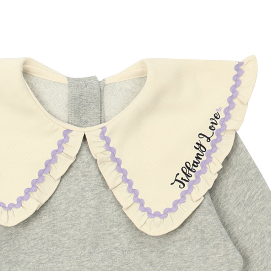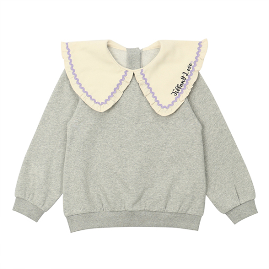 상세설명-배색 빅카라가 포인트인 멜란지 맨투맨으로 프릴위쪽에 연보라 물결 테이프가 한층더 귀여운 느낌을 더해주며, 카라끝에 자수가 포인트인 아이템입니다.