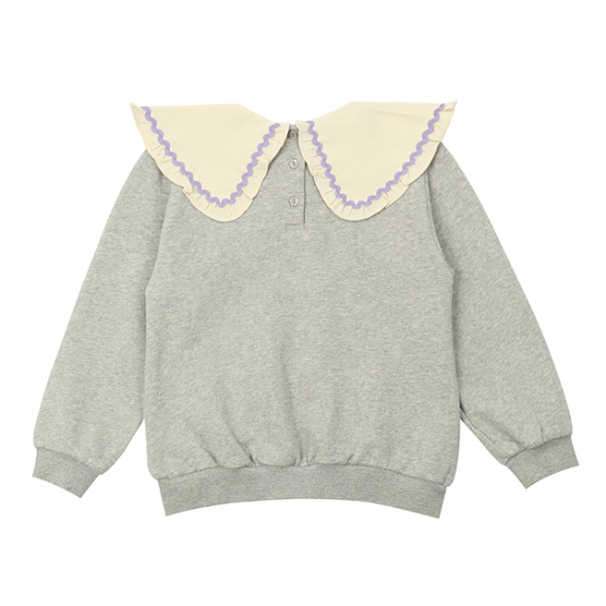 상세설명-배색 빅카라가 포인트인 멜란지 맨투맨으로 프릴위쪽에 연보라 물결 테이프가 한층더 귀여운 느낌을 더해주며, 카라끝에 자수가 포인트인 아이템입니다.