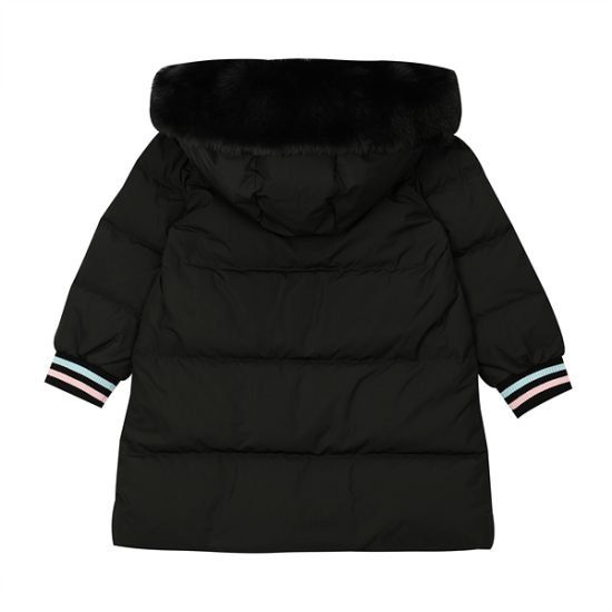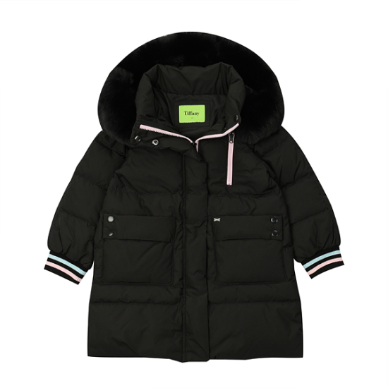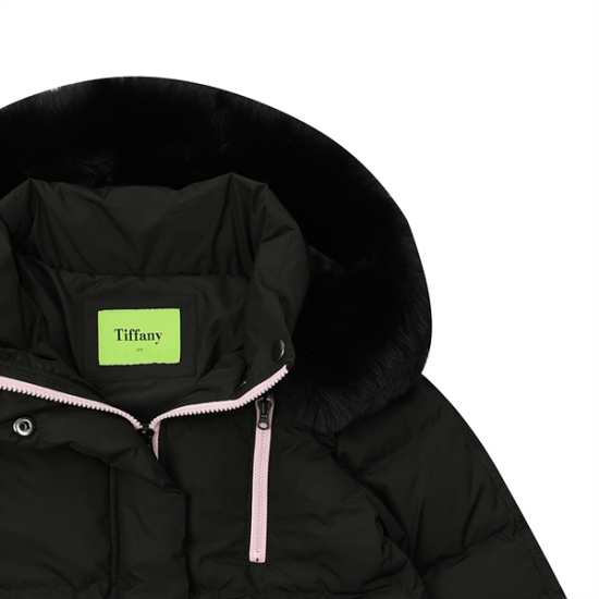 상세설명-부드러운 터치감의 블랙 화섬 오리털 점퍼입니다. 중힙 기장보다는 길고 기존의 롱점퍼보다는 짧은 기장입니다.