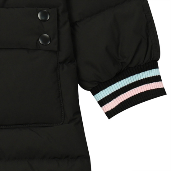 소매 스트라이프 시보리로 포인트를 주고 비슬론 지퍼를 배색 핑크로 하여 컬러감을 살려주었습니다. 후드는 탈착으로 하여 스탠 에리 형태로도 착용이 가능합니다.