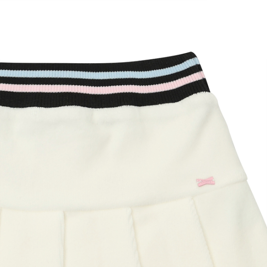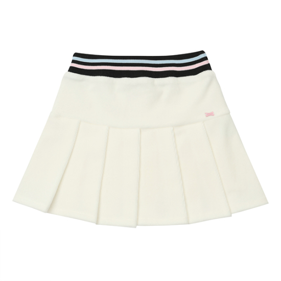 상세설명-벨로아 골지 소재를 사용한 주름 스커트입니다. 허리 스트라이프 시보리로 포인트를 주었고 핑크 리본 장식으로 깔끔하게 포인트를 주었습니다. 같은 소재 집업티(T36KAT030)와 코디하여 SET 착장이 가능합니다.