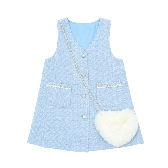 상세설명-연블루 트위드점퍼원피스로 단추로 앞오픈이 가능한 스타일이며, 탈부착 털가방이 같이 구성되어 한층더 유니크함을 더해주는 아이템입니다.