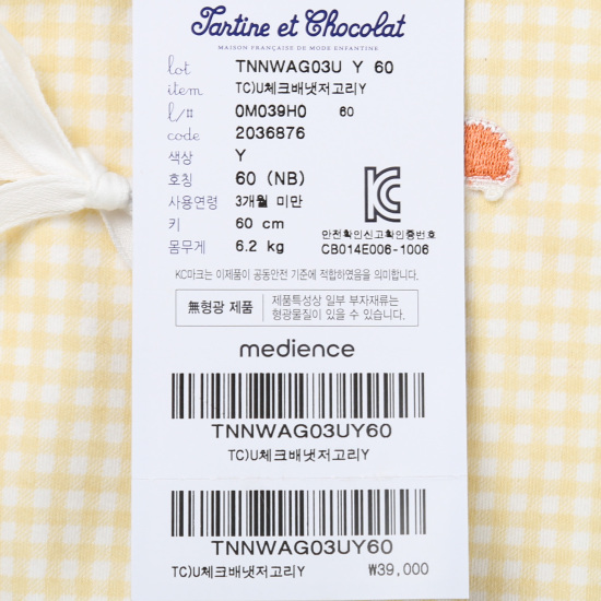 (롯데백화점)체크배냇저고리Y TNNWAG03UY(임신출산선물)