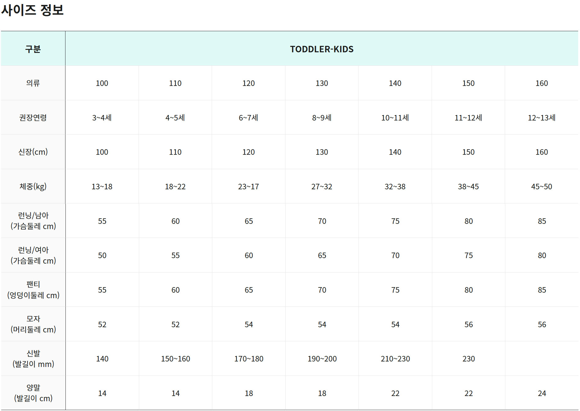 | 신체 호칭/치수 | 100 | 110 | 120 | 130 | 140 | 150 |