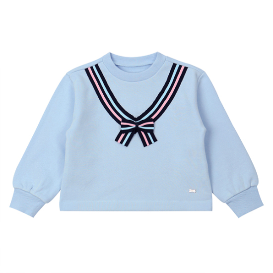 밑단이 일자로 내려오는 크롭 스타일 티셔츠입니다. V라인으로 스트라이프 TAPE 장식으로 포인트를 살리고 탈착리본 브롯치로 포인트를 살린 스타일입니다. 주름 스커트와 코디하여 트렌디하게 연출할 수 있습니다.