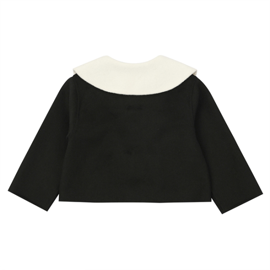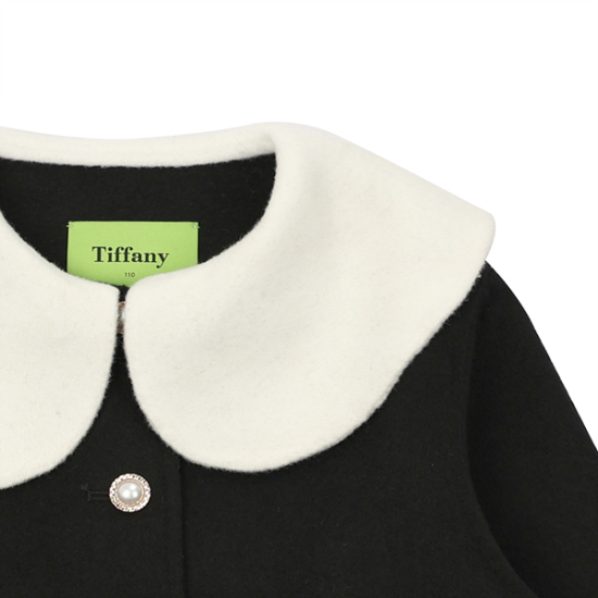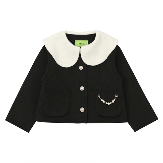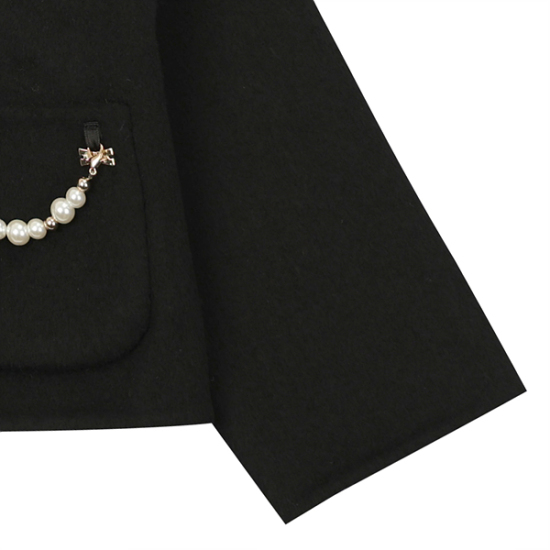 빅카라를 아이보리로 배색을 하여 얼굴이 화사해 보이도록 하고, 아웃포켓에 진주 체인 장식을 달아 포인트를 주었습니다.