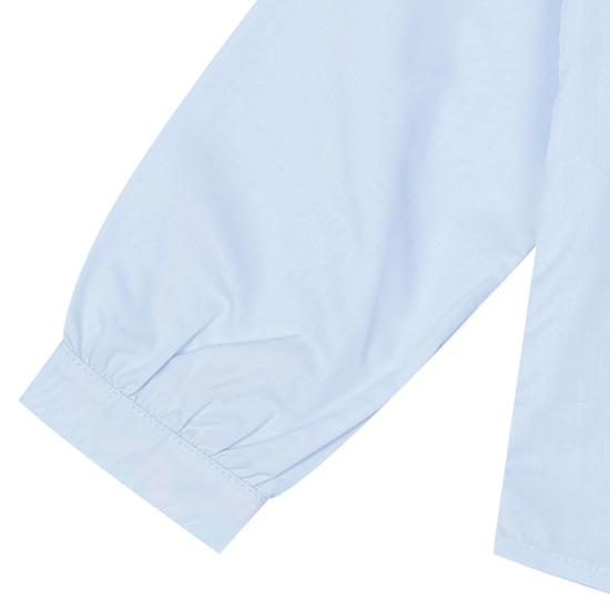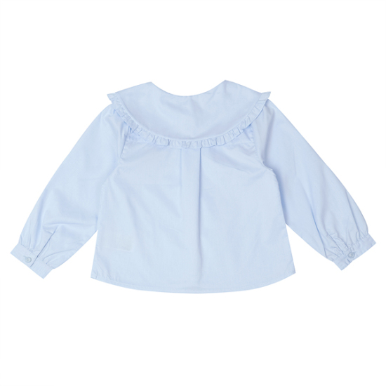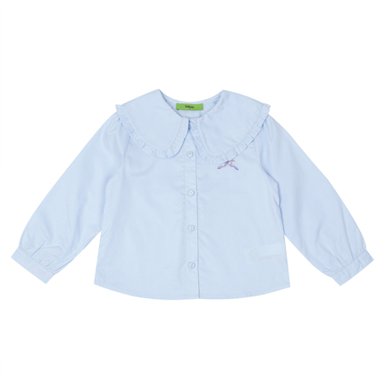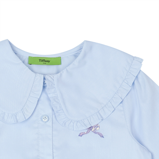상품설명-면스판 소재 블라우스로 빅프릴 카라 장식으로 포인트를 주었습니다. 가슴에 작은 리본 스팽글 자수가 포인트로 있습니다.