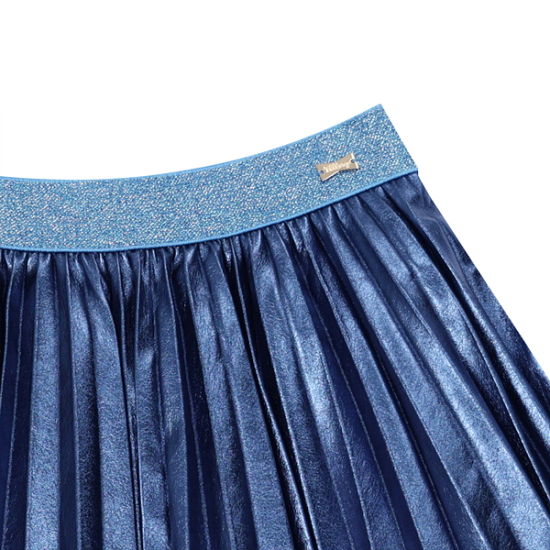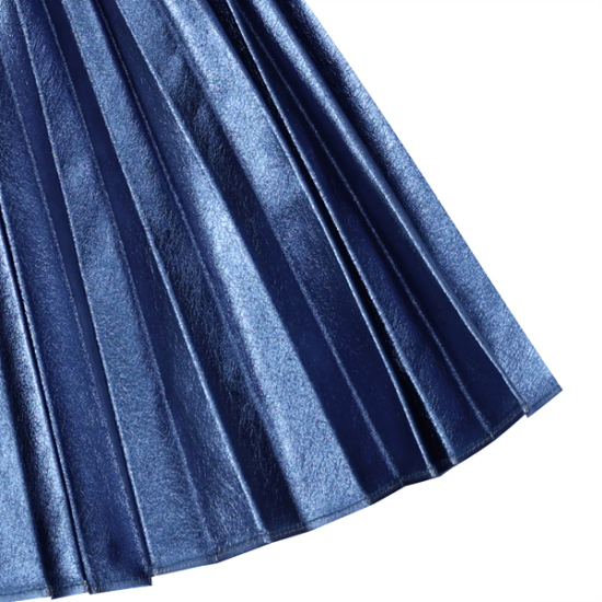 상세설명-톤 다운된 블루 컬러 레쟈 아코디언 주름 스커트로 트렌디한 룩을 연출하기 좋은 스타일입니다. 야구 점퍼와 코디하여 캐주얼한 룩을 보여주기 좋은 아이템입니다.