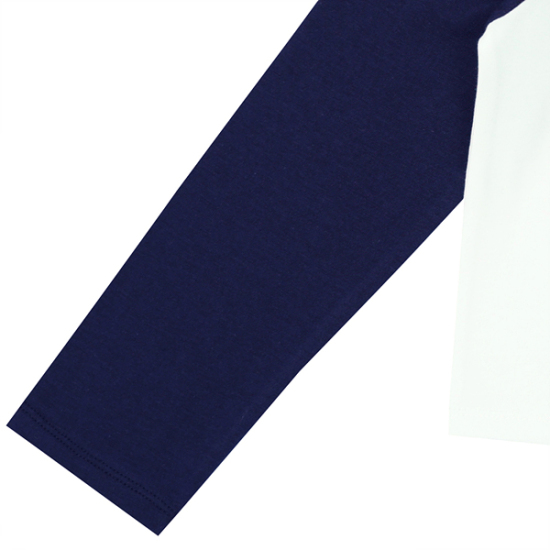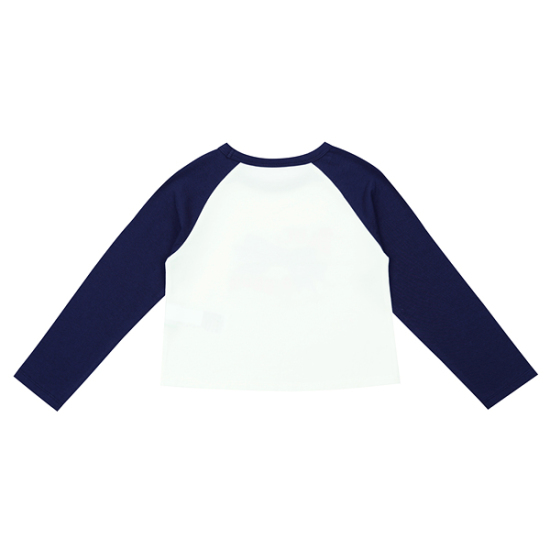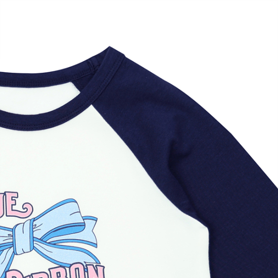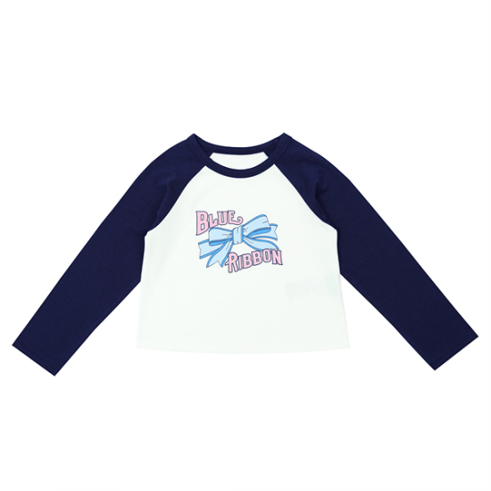 상세설명-라글란 소매 컬러배색 티셔츠로 앞에 트렌디한 리본 프린트로 포인트를 준 티셔츠입니다. 초가을 이너로 착용하기 좋은 두께입니다.