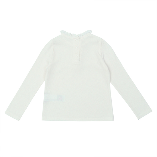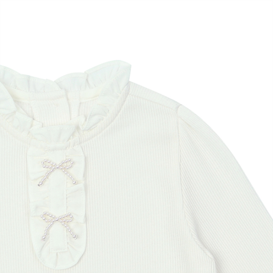 상세설명-잔골지 소재 티셔츠로 넥라인에 프릴 장식과 앞단작 장식으로 갈끔함을 살린 티셔츠입니다. 앞단작 위에 작은 진주 리본 장식이 포인트로 들어간 스타일입니다.